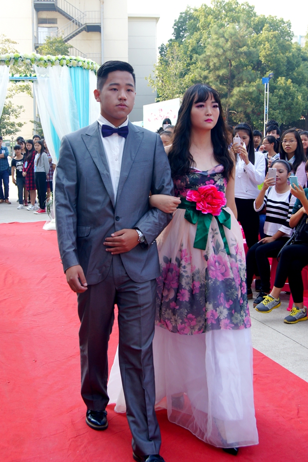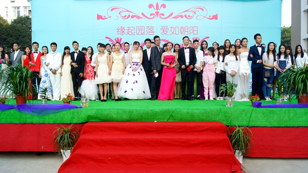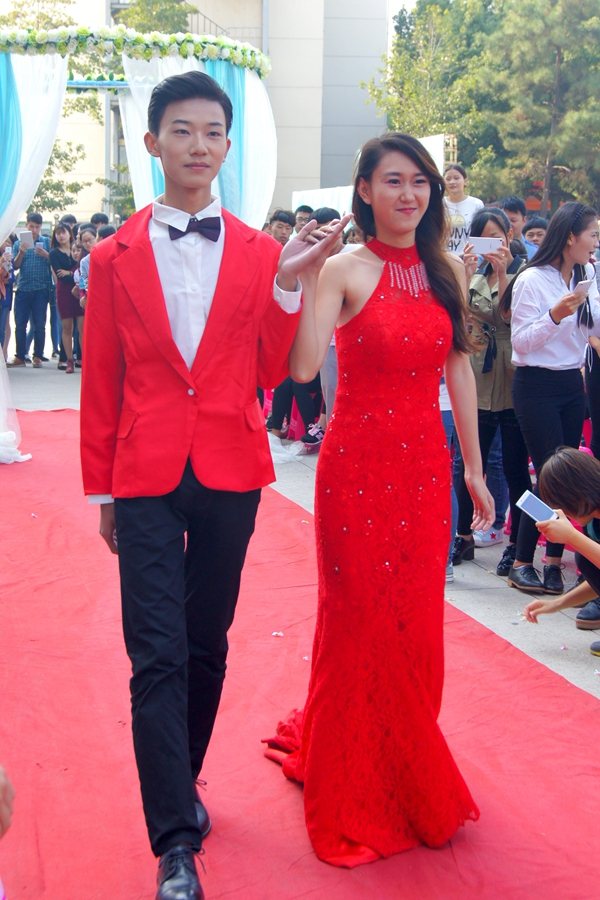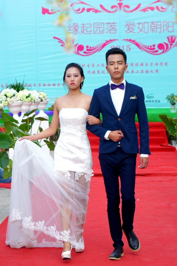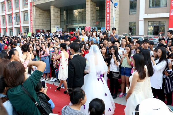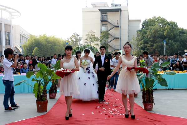 纯白婚纱,大红地毯,亲朋好友座上宾,茶水甜点席上摆……空气中弥漫着甜蜜的味道,一切梦幻而美好。10月22日下午1点58分,一场“婚礼”在学院的广场拉开帷幕。