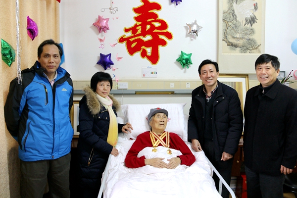 元月5日上午,湖北生态工程职业技术学院党委书记宋丛文、纪委书记李启云携相关部门负责人和学校师生代表,专程前往华中科技大学同济医学院附属梨园医院,为学校离退休干部、老红军芦桂秀同志庆祝百岁华诞。