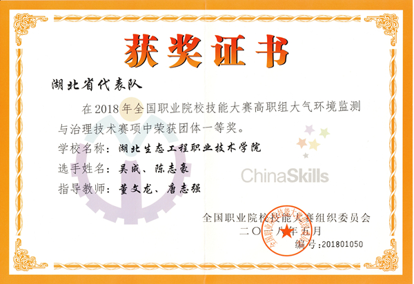 5月12日,2018年全国职业院校技能大赛高职组“大气环境监测与治理技术”赛项在天津圆满落幕。来自全国的57所高职院校参加,湖北生态工程职院作为湖北省领队院校参加此次比赛。学校2016级环境工程技术专业陈志豪和吴成两名同学以总分第二的优异成绩获得“团体一等奖”,指导教师董文龙、唐志强获“优秀指导教师” 荣誉称号。