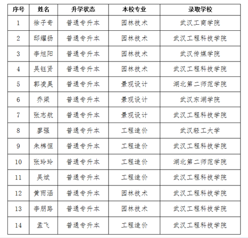 园林建工学院一直以来重视学生专升本工作,辅导员多次进行宣传并组织报名,帮助他们解读考试政策,在选报院校、专业上上给予指导。此次,这批同学能进入本科院校继续深造,是我院不断深化教学改革,提高教育教学水平,注重培养学生学习能力,加强学风建设的具体体现。为今后园林学子积极参加专升本考试,带来了榜样效应,增强了他们的信心。