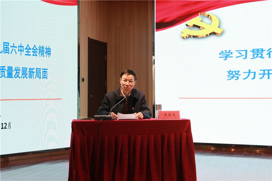 王昌友围绕三个方面进行了宣讲。一是深刻认识党的十九届六中全会的主要内容、重要成果和重大意义。指出审议通过的《中共中央关于党的百年奋斗重大成就和历史经验的决议》是全会的重要成果。二是准确理解和把握《决议》的主要内容。阐释了《决议》内容的两个特点是主要总结了党的百年奋斗重大成就和历史经验;突出了中国特色社会主义新时代这个重点,用较大篇幅总结党的十八大以来的原创性思想、变革性实践、突破性进展和标志性成果。一个突出亮点是对习近平新时代中国特色社会主义思想的概括和阐述。一个重大政治论断是“两个确立”是党的十八大以来最重要的政治成果。并对四个历史时期、十个明确、十三个方面的历史性成就和历史性变革、五大历史意义、十条历史经验、一个伟大号召进行了详细的解读。三是深入贯彻落实六中全会精神,推动学校高质量发展再上新台阶。要求全校教职工在学习宣传六中全会精神上下功夫、在提升学校党建工作水平上下功夫、在推动学校高质量发展上下功夫、在维护学校平安稳定上下功夫,把全会学习成果转化为推动学校高质量发展的强大动力。