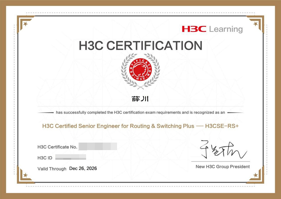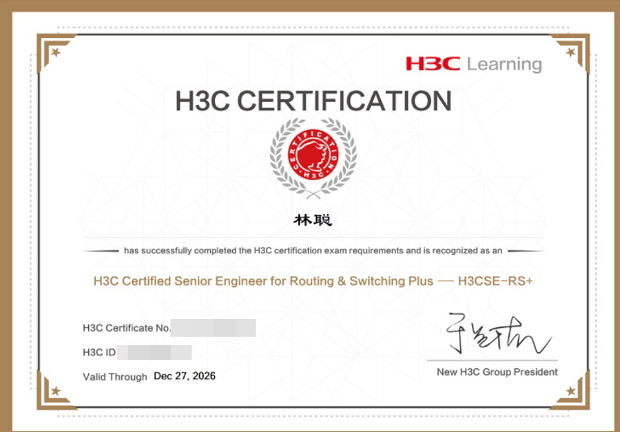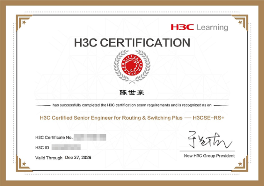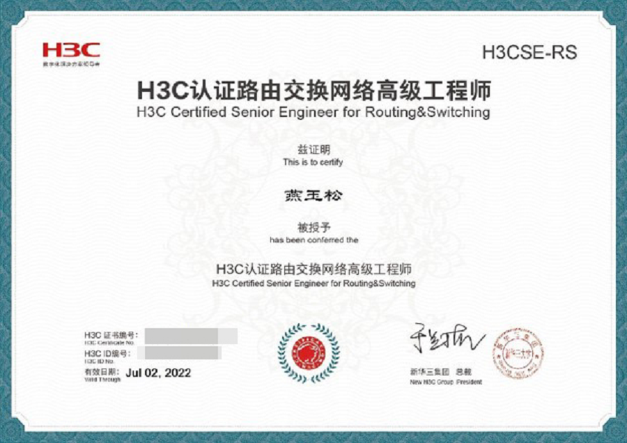学生考取的H3C认证高级网络工程师(H3CSE-RS)