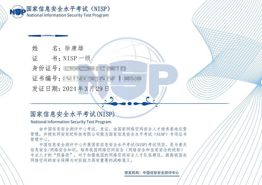 学生考取国家信息安全水平一级认证(NISP)证书