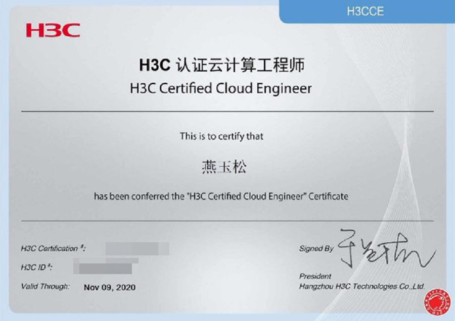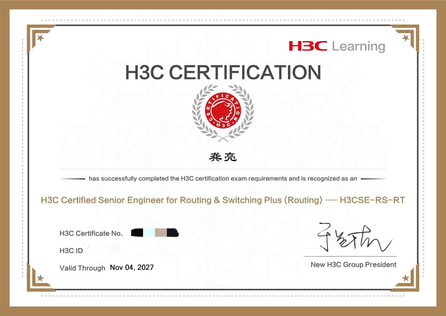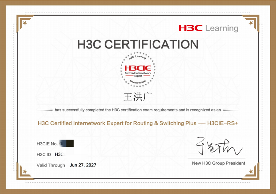 主要职业资格证书:H3C认证网络工程师(H3CNE-RS)、H3C认证高级网络工程师(H3CSE-RS)