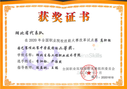 11月10日,2020年全国职业院校技能大赛改革试点赛(高职组)园艺赛项在山东省潍坊职业学院隆重闭幕,我校代表湖北省参赛,荣获团体二等奖。参赛选手为园林建工学院2018级园林技术专业学生严浩然、李泗钰,指导教师为陈益娴、王聪。
